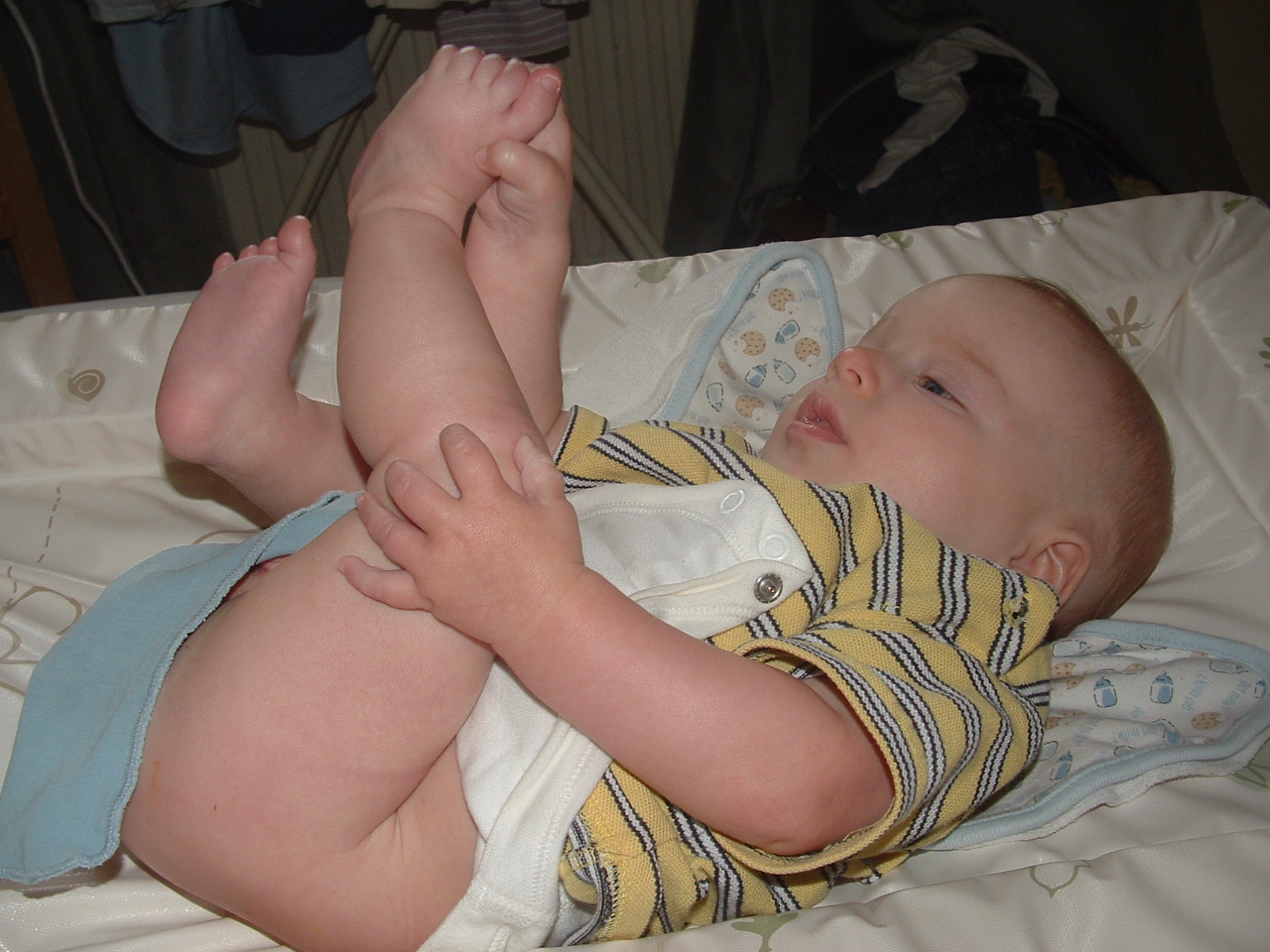 Here's a proper smile! I nearly always get a smile or even a laugh when it's time to change Franklin. He just wiggles his legs and laughs at the ceiling. Then he spreads his arms and legs out, so I call him a little starfish and tickle his tummy. Then he laughs some more.